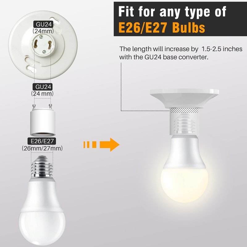 - Length: JACKYLED GU24 socket converter increases the length by 1.5 to 2.5 inches depending on the depth of the base you are screwing into.