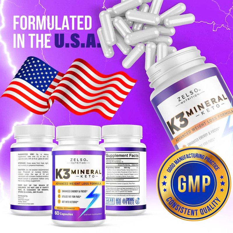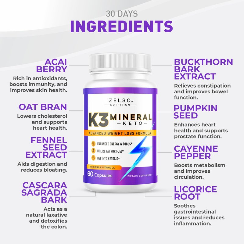 - BURN FAT FOR ENERGY: Introducing K3 Mineral Pills by Zelso, World's #1 Formula for triggering Ketosis, prompting the body to burn stored fat for energy by producing ketones, facilitating effective weight loss and fat reduction.