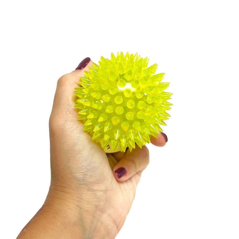 These flashing spiky squeaky balls are rubbery, squeezable, bouncy, and light up.