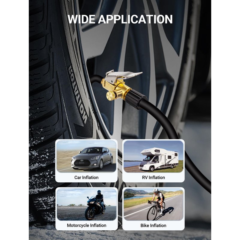 【Widely Applicable】Maximum endurance pressure is up to 250 PSI, ideal for conveniently inflating tires with schrader valve, widely applicable for various vehicles, bikes, motorcycle, car, etc. If you are looking for a durable air chuck set, this one is for you.