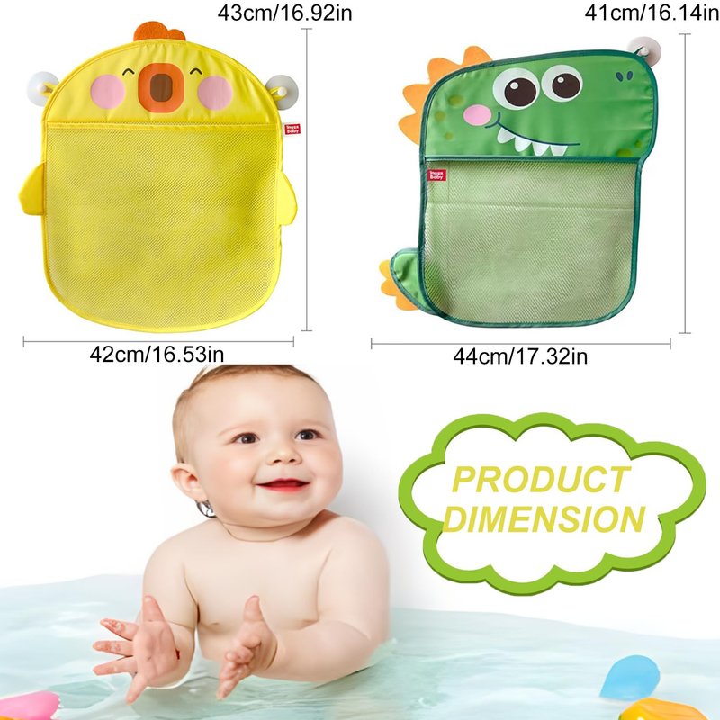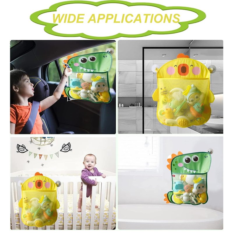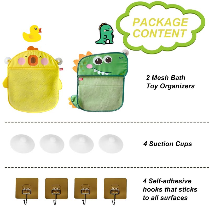 - 【WHAT YOU WILL GET】The bathroom toy organizer bags are perfect bathroom storage and organization solution. You will receive 1 x duck shape bath toy storage net and 1 x dinosaur shape bath toy storage net, 4 x suction cups, 4 x adhesive hooks (Style Random). Notices: bath tub toys not included