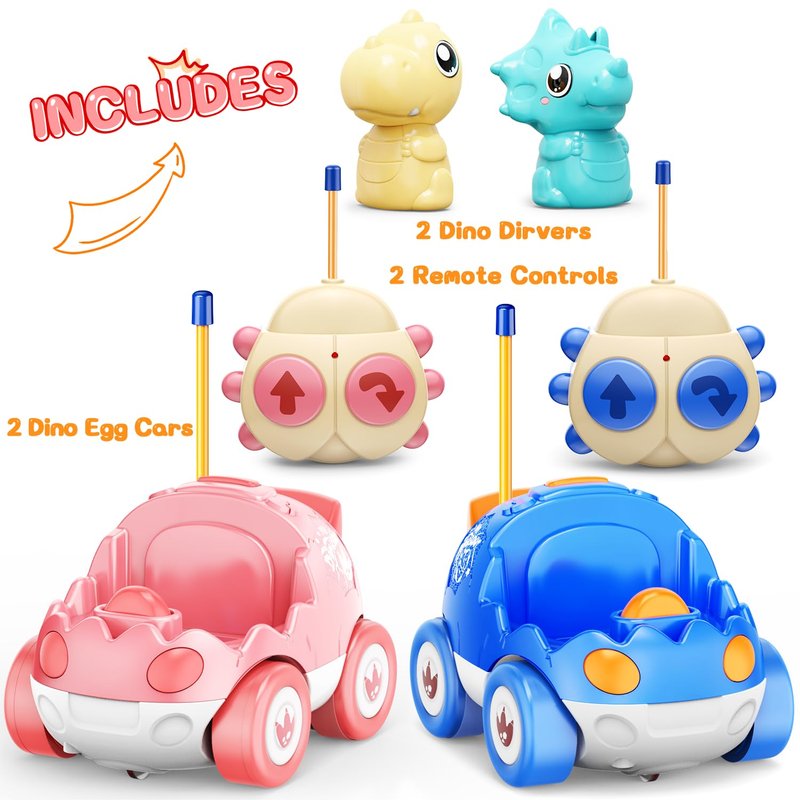 - 【A set with 2 remote control cars】 This is a set of two egg-shaped remote control cars for toddlers with music, sound, and light features, two interchangeable dinosaur figures, and two remote controls that move the cars forward and backward left.