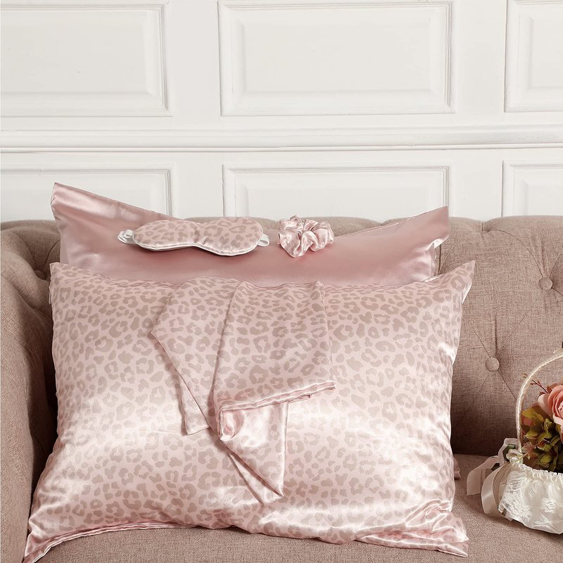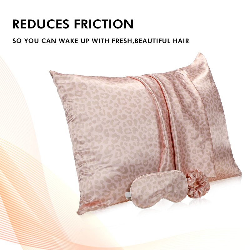 2 Pack Satin Pillowcase with Latent Zipper, Adjustable Satin Eye Mask for Sleeping and Satin Volume Scrunchie for Hair and Skin, Standard Size (Pink, Leopard Style)