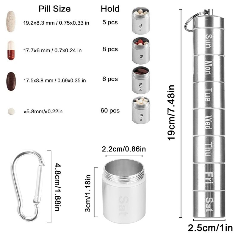 - 【WIDE APPLICATIONS】Perfect for outdoor travel, camping, hunting, hiking, fishing, cycling, golfing, adventure, first aid, outdoor life-saving and other outdoor activities or home use. Package include 2 pack 7 days pill organizer/ metal pill container/ daily pill dispenser with a keychain and a carabiner