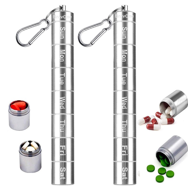 2 Pack Weekly Pill Box, 7 Day Pill Case, BravOne 7 Compartments Aluminum Alloy Portable Pill Holder Waterproof Medicine Organizer Mini Metal Pill Container with Keychain & Carabiner for Travel Camping