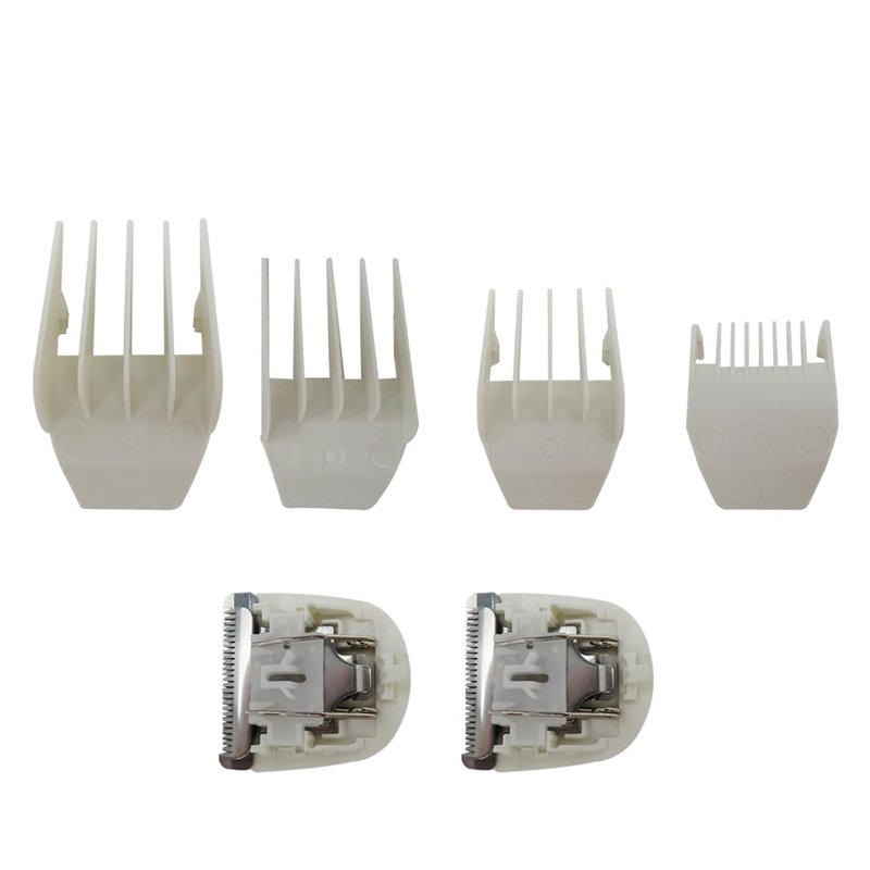 Package Includes: 2-pack white clipper trimmer blades, 4-pack attachment comb cutting guides