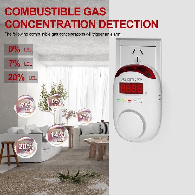 - 【Alarm Alert】- When the concentration of combustible gas leaks to a preset level, the gas detector alarm will sound an 85dB alarm as well as display the concentration level of the gas.