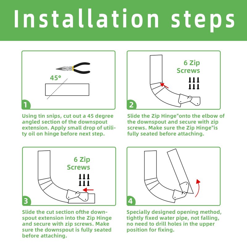 - Easy Installation - Hinge installs easily on any size rectangle or square downspout. Hinges can be painted to match any downspout color.