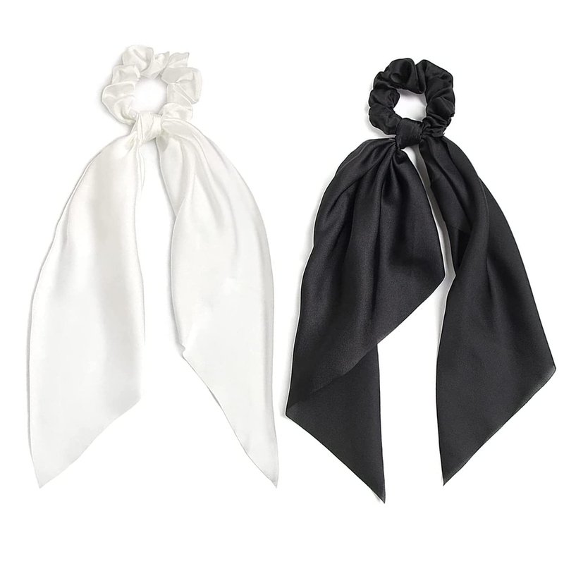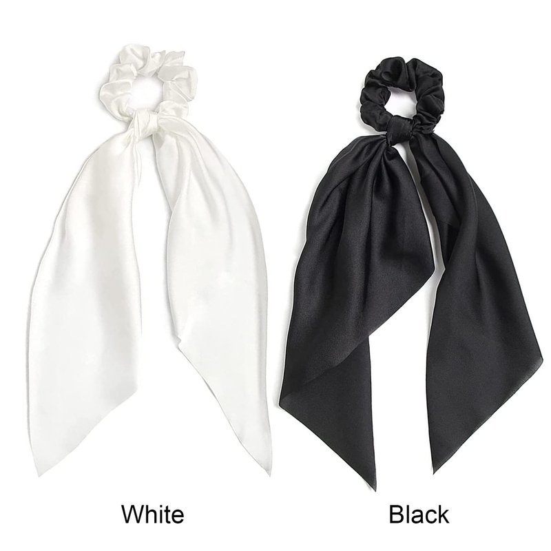 2 PCS Hair Scrunchies Scarf White Black Hair Ribbon Satin Silk Elastic Hair Tie Bow Bands Ponytail Holder Accessories for Women Girls