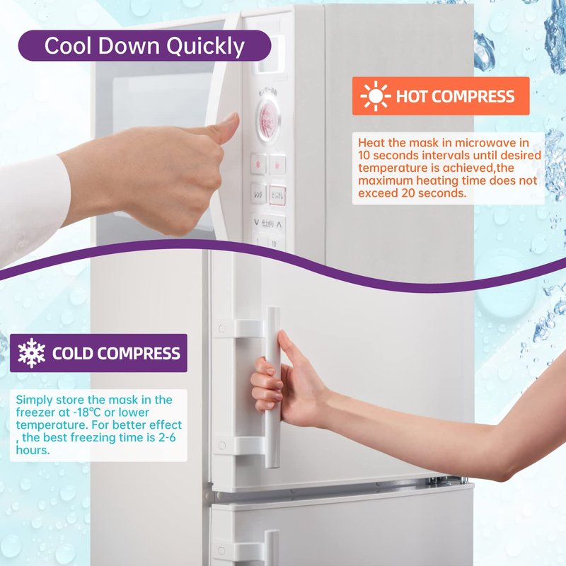 - 【CONVENIENT TO USE】Sealed the eye mask in a plastic bag and simply store the mask in the freezer at -18℃ or lower temperature for at least 1 hours. For better effect,the best freezing time in the freezer is 2-6 hours .For heat therapy,heat the mask in microwave in 10 seconds intervals until desired temperature is achieved,the maximum heating time does not exceed 20 seconds. And the best therapy time is approximately 15 minutes recommended by doctor and therapist.