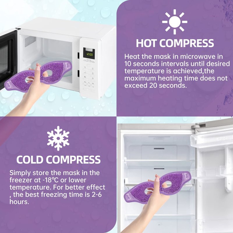- Easy To Use: Sealed the eye mask in a plastic bag and simply store the mask in the freezer at -18℃ or lower temperature for at least 1 hours. For better effect,the best freezing time in the freezer is 2-6 hours .For heat therapy,heat the mask in microwave in 10 seconds intervals until desired temperature is achieved,the maximum heating time does not exceed 20 seconds. And the best therapy time is approximately 15 minutes recommended by doctor and therapist.