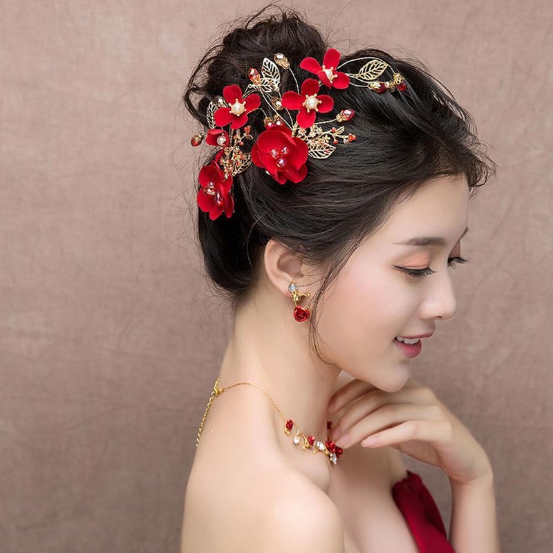• 【Design】Wedding hair accessories are designed with 3 red floral, decorated crystals and pearls, and a gold border outlines the leaves with golden hollowed out. The overall design is luxurious, stylish, and unique, making your wedding look particularly eye-catching.
