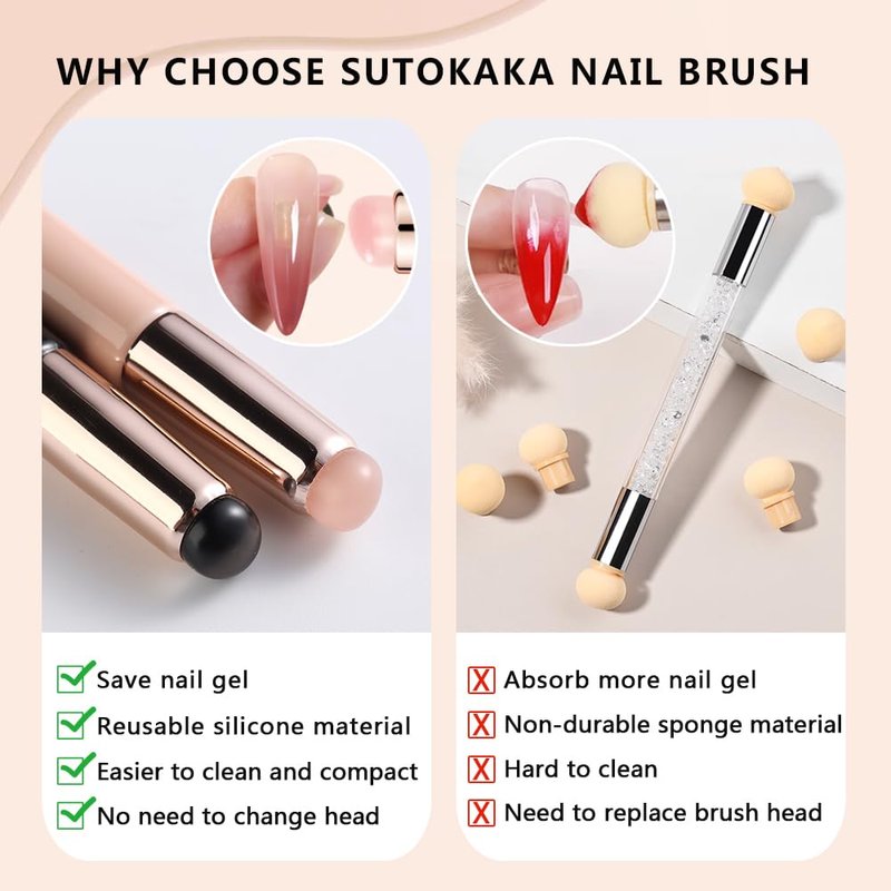 SUTOKAKA Silicone Nail Brush is a professional nail art brush, it can be used to apply chrome nail powder, create blush gradient ombre nails and French nails, and transfer nail art stampers patterns, suitable for professional nail salon and home, nice nail art DIY tools for women and girls.