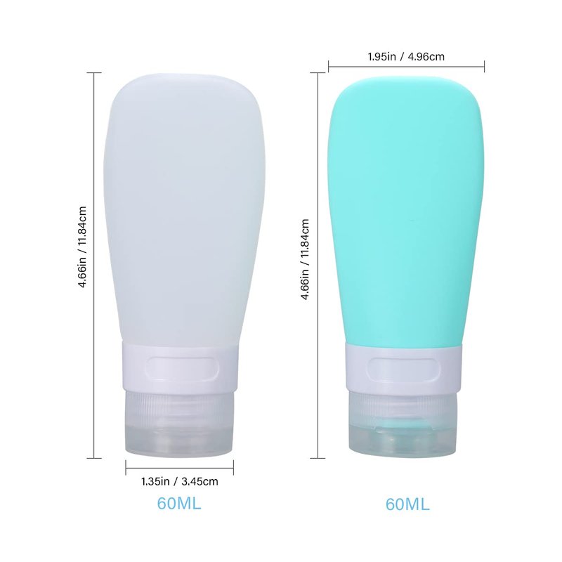 - Portable Travel Bottles Set--The 2-piece green and white 2oz silicone travel bottle set comes with a transparent carrying bag, which is suitable for filling liquid cosmetics or toiletries on travel.