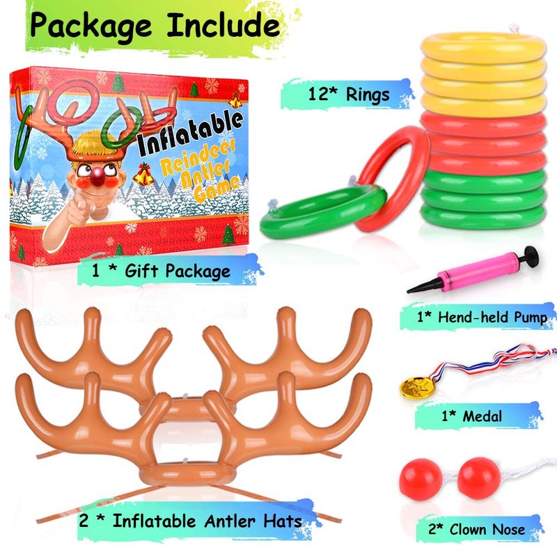 - NEW REINDEER TOSS GAME SET [MORE FUN] -- Exquisite gift package include 2×Inflatable Antler Hats, (12×Inflatable Rings- 4×Red, 4×Green, 4×Yellow), (1×Hand-held pump, 2×Reindeer Nose, 1×Gold Medal); you can have 2-8 person playing at the same time.