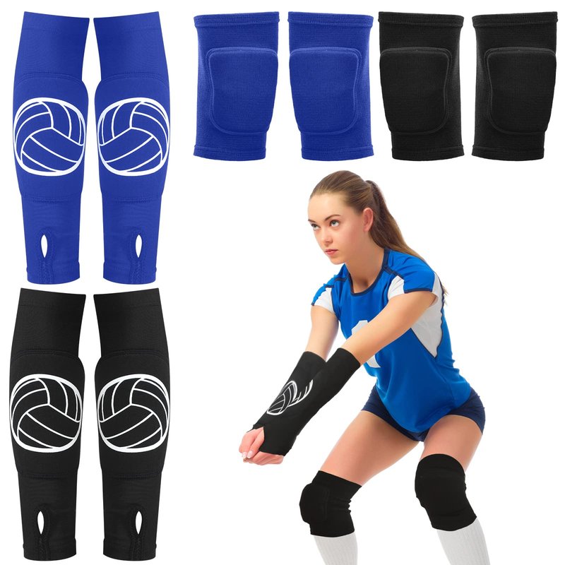 2 Set Volleyball Knee Pads and Volleyball Arm Sleeves with Protection Pad Compression Forearm Wrist Guard with Thumb Hole Soft Breathable Pads for Women Kids Girls Youth Hitting Passing (Black, Blue)