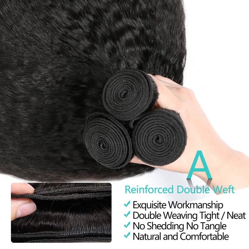 - 2.Kinky Staight Bundles Human Hair Quality: Grade 12A Double Machine Weft, 100% Unprocessed Brazilian Virgin Human Hair Bundles, No Shedding, No Tangles, No Lice.