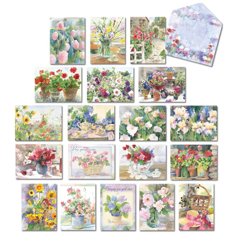 Introducing Leanin' Tree's Art of Judy Buswell's Greeting Cards Assortment Box. These beautifully designed watercolor cards with envelopes include 20 all occasion cards assortment box with envelopes. Whether it's a happy birthday card, a sympathy card, a get well soon card, or simply blank cards and envelopes to express your feelings, this Greeting Cards Assortment Box has got you covered. The set also includes 22 colorfully designed envelopes to add an extra touch to your messages. This All Occasion Cards Assortment Box with Envelopes Includes: 8 Birthday Cards, 1 Anniversary Card, 3 Blank Cards, 1 Encouragement Card, 2 Friendship Cards, 2 Get Well Cards, 1 Sympathy Card, 1 Thank You Card, and 1 Wedding Card so this greeting card assortment will ensure that you are always prepared to send out your best wishes throughout the entire year. Send blank cards and envelopes and craft your own personalized messages inside them to express yourself to loved ones. These artistic watercolor cards with envelopes have stunning floral designs by world renowned artist, Judy Buswell and they are sure to add a sophisticated flair to your blank note cards and greeting cards. Each card is printed on recycled paper using soy-based inks, a testament to Leanin' Tree's commitment to sustainable practices. The colorful interiors of the cards, along with the colorfully designed envelopes, make your messages stand out, whether you are giving heartfelt sympathy cards or happy birthday cards. This assortment isn't just about quality, but also convenience. The box doubles as a greeting card organizer, keeping your cards neat and ready for any occasion. And the best part? This entire set is made in the USA, promising premium quality and supporting local businesses. Whether you're in need of a friend's birthday card, a condolences card, or a simple thank you card, this all occasion cards assortment box with envelopes will have you covered. It's not just a box of cards; it's a box of emotions, ready to be shared. So why wait? Add this beautifully designed greeting card assortment box your collection today.