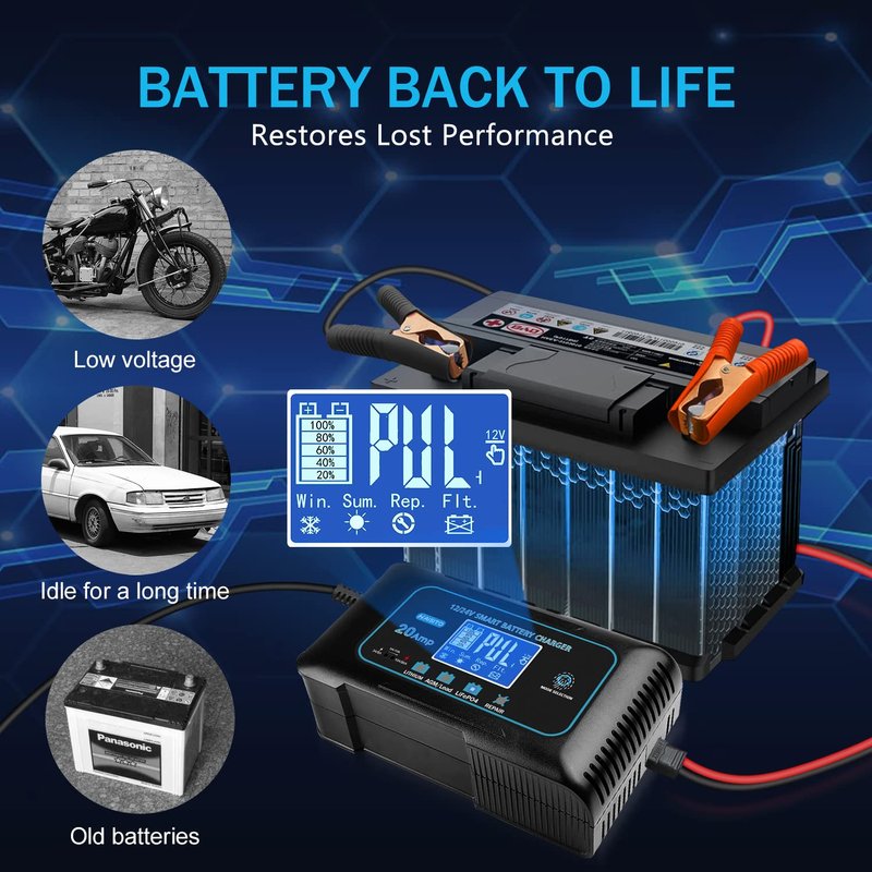 20 Amp Lithium Battery Charger, 12V and 24V Lifepo4,Lead-Acid(AGM/Gel/SLA..) Portable Car Battery Charger,Battery Maintainer, Trickle Charger, and Battery Desulfator for Car,Boat,Motorcycle…