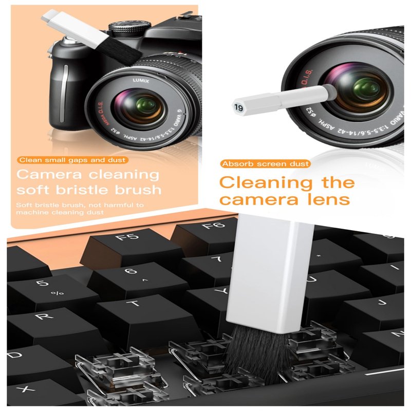 - 【Clean Screen and Camera】Our cleaning kit comes with a round cleaning cloth on the lid, and the included cleaning cloth and spray bottle (with cleaner) can effectively remove dirt and fingerprints from the screen. Press the hair dryer to blow away the dust from the gaps in the camera. We provide two types of mouthpieces for you to replace, and a soft-bristled short brush can absorb dirt and dust on your camera.