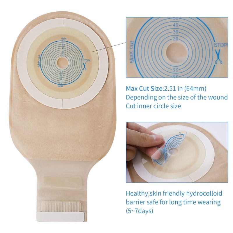 Package Includes: *20 x One piece system ostomy bags *1 x Ostomy measure card *1 x Instruction book SPECIFICATIONS: Pouch size :215*155*40mm Max cut: 20mm-60mm /0.79-2.36 inch Baseplate thickness:1.0mm PRODUCT DESCRIPTION This product is a nursing device for ileum, colon, rectum or urethrostomy. Product contacts intact skin and intestinal lumen. Supplied non-sterile. SCOPE OF APPLICATION/INTENDED USE This product is used for the collection of stoma excreta.