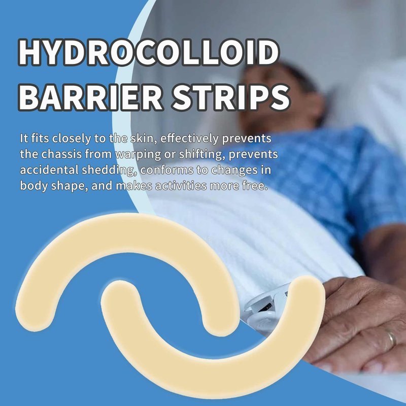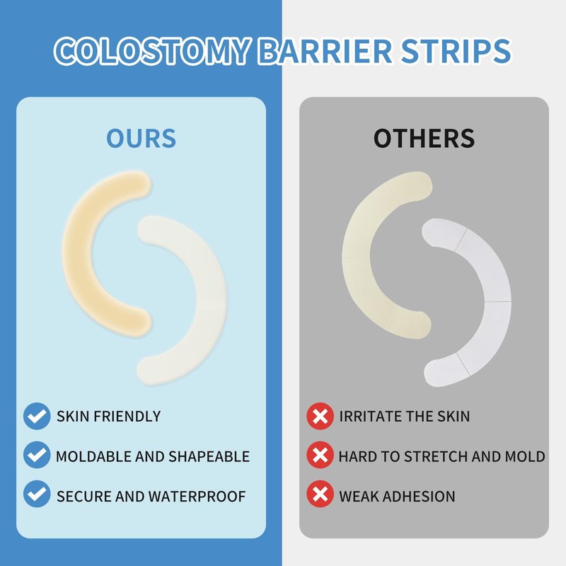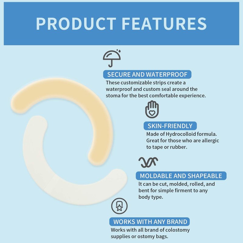 - 🌙 SKIN-FRIENDLY HYDROCOLLOIDS -- Our self-adhesive Ostomy Barrier Strips are precut and preshaped made with latex-free and non-irritating hydrocolloid formulations. The ostomy tape of hydrocolloid has strong adhesion and is easy to remove without stinging, effectively preventing the damage of excrement to the skin around the stoma.