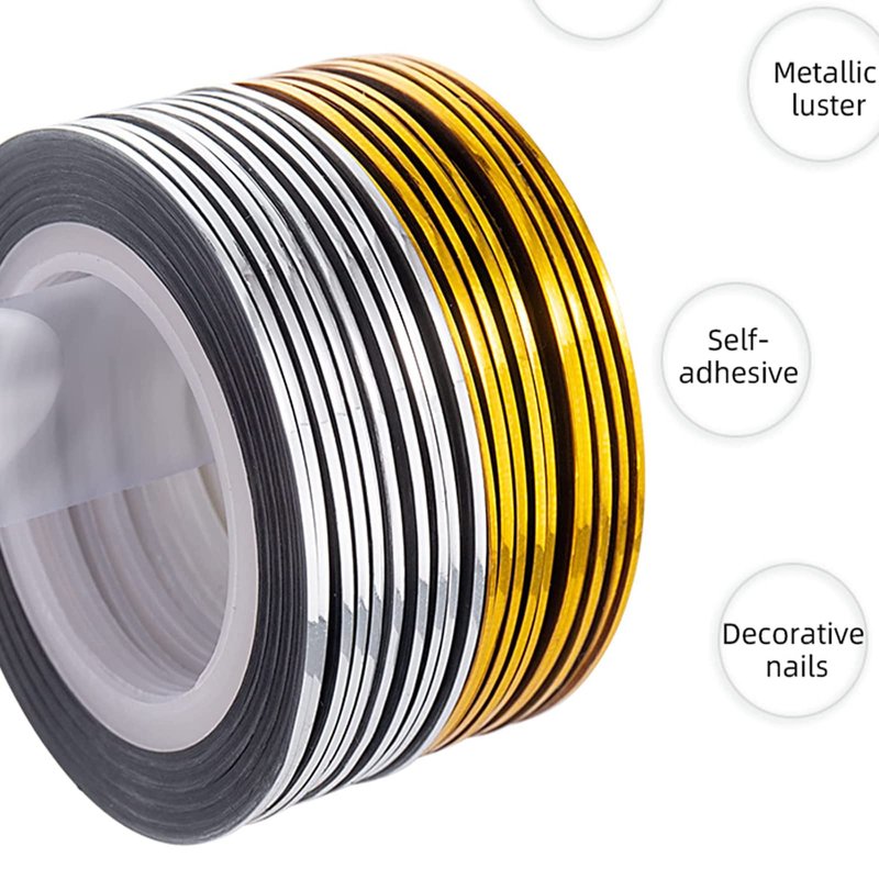 - 20 Pcs Striping Tape Line Sets : - Approx.4.5cm (Diameter), Width: 1mm, Thickness:0.1mm Length :20m. Come with multicolor: silver gold nail stickers, Self-adhesive, no glue is needed, clean and convenience for use. If you use some kind of top coat over the gold strips for nails lines they will last longer and won’t loose any shine.
