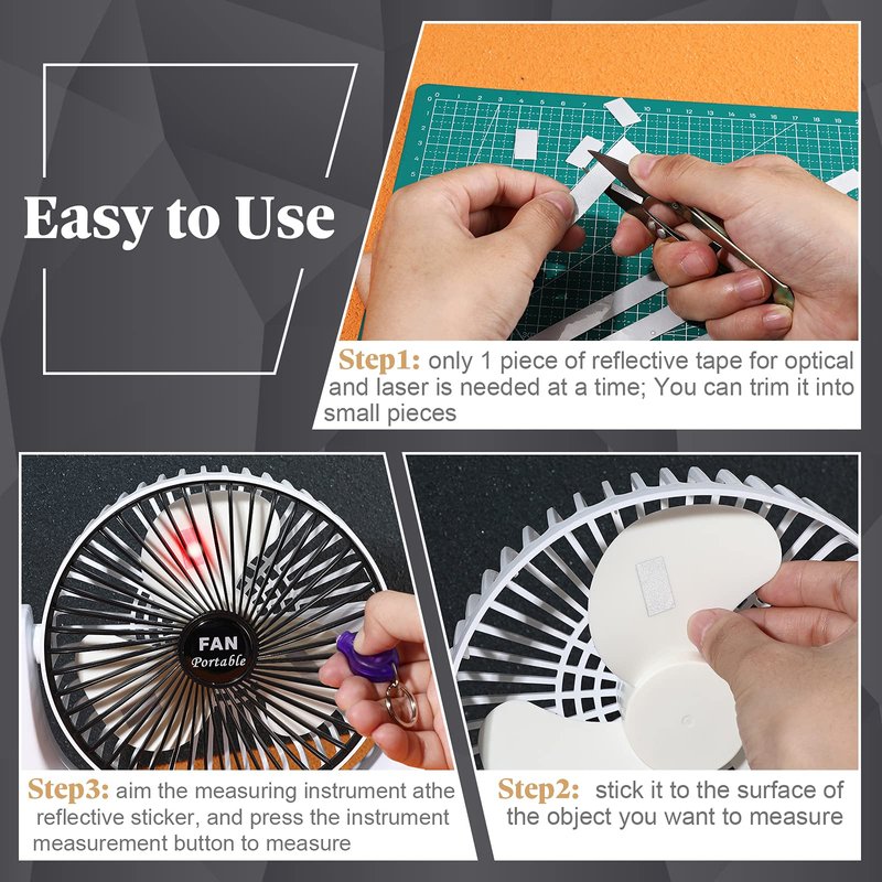 - Easy to use: only 1 piece of reflective tape for optical and laser is needed at a time; You can trim it into small pieces, stick it to the surface of the object you want to measure, and then aim the measuring instrument a the reflective sticker, and press the instrument measurement button to measure