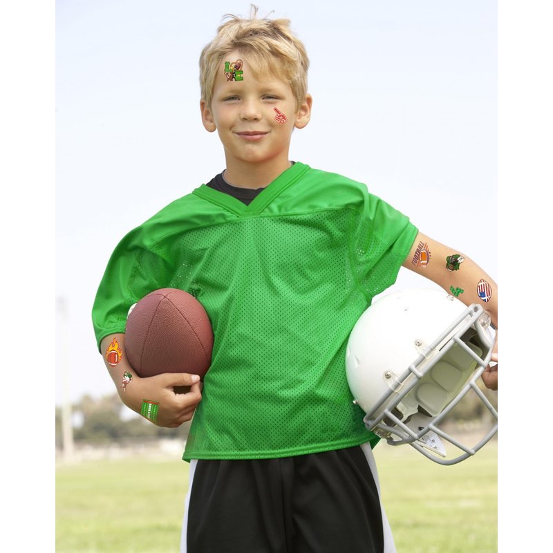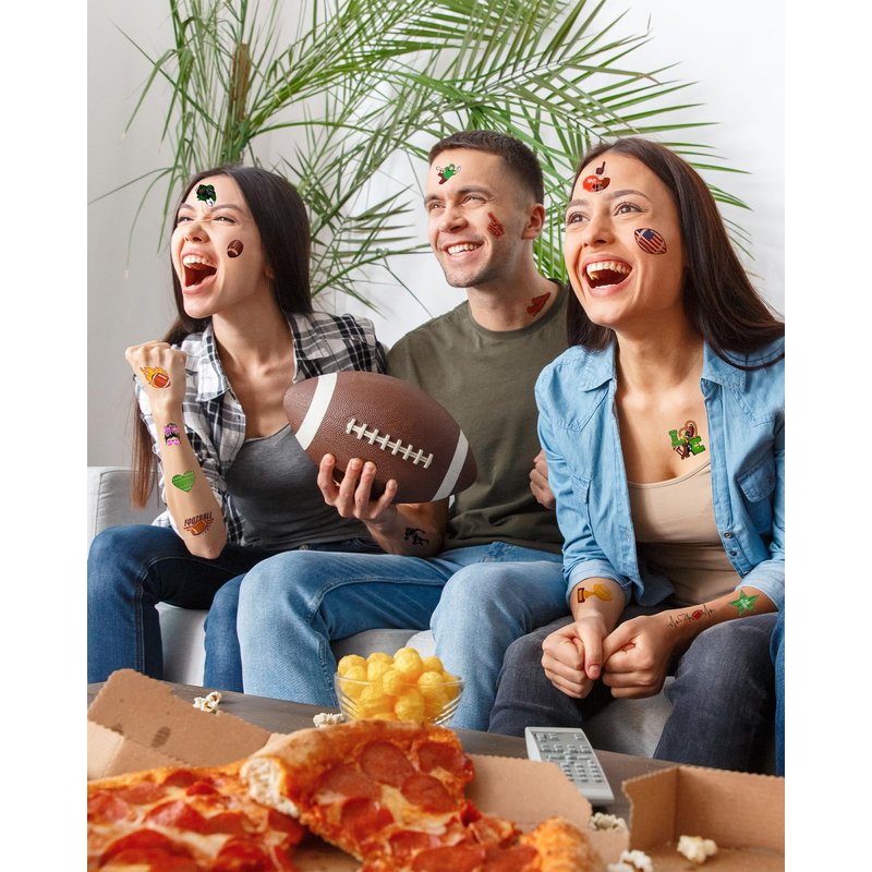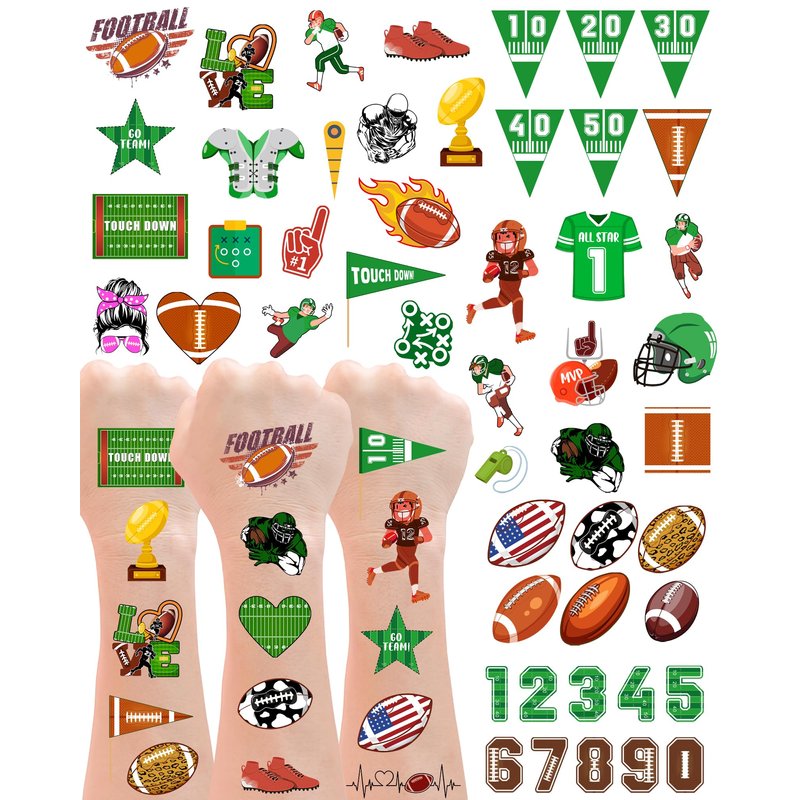 - Brown and Green Football party decorations Package includes 228 pieces of Football themed temporary tattoos, which can be used wherever you want, such as arms, face, and hands