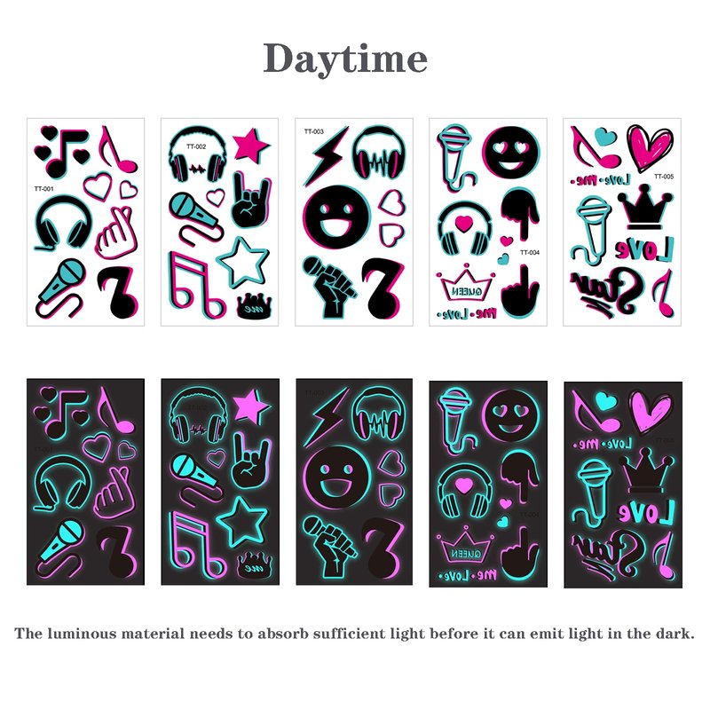 - Our music-themed tattoos are perfect for anyone who loves to express themselves through music and dance, and are a must-have for anyone who wants to join in on the latest Glow Party trend.Our glow in the dark temporary tattoos kit is suitable for glow rave, carnivals parties, glow in the dark party makeup, musical festivals, blacklight party and birthday parties, make any rave or party even more unforgettable.