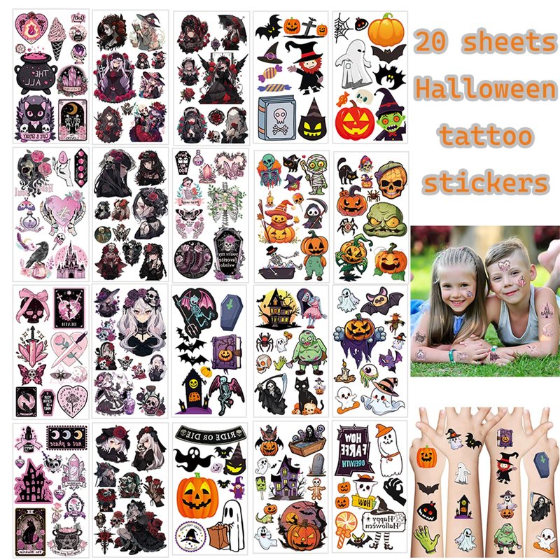 20 Sheets Halloween Temporary Tattoos Stickers Witch Tattoos Stickers Birthday Themed Party Supplies Decoration Favors Cartoon Cute Sticker for Kids Boys Class Prizes Carnival Christmas Rewards