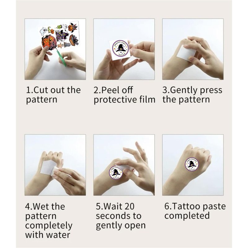 We recommend that you clean the place where you want to stick the tattoo to make it more realistic. If you lightly apply baby powder on the tattoo area with a makeup brush, the temporary tattoo will last longer. Avoid rubbing or scrubbing the tattoo area when taking a bath, otherwise the tattoo will fall off quickly, shortening the use time.