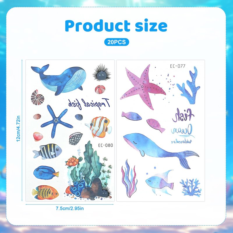 - Package Content: You will receive 20 sheets of ocean creature temporary tattoos, each piece measures 12x0.05x7.5cm/4.72x0.02x2.95in. Various quantities and types to meet your daily needs or share with friends.