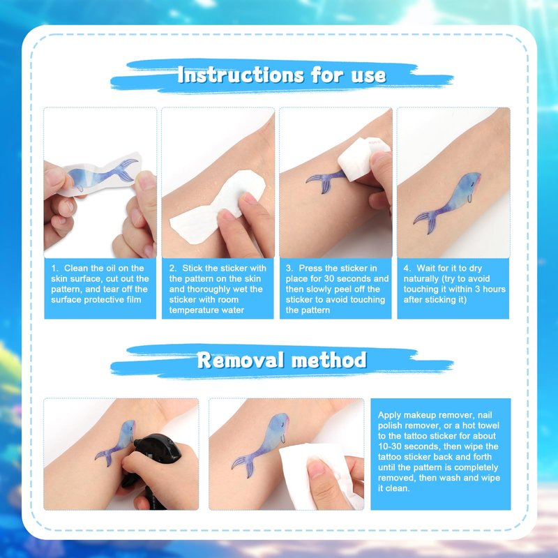 - Product Material: The materials used in our sea creature temporary tattoos are water transfer paper, environmentally friendly ink, environmentally friendly glue and polyethylene protective film, which will not harm your skin and are beautiful and durable.