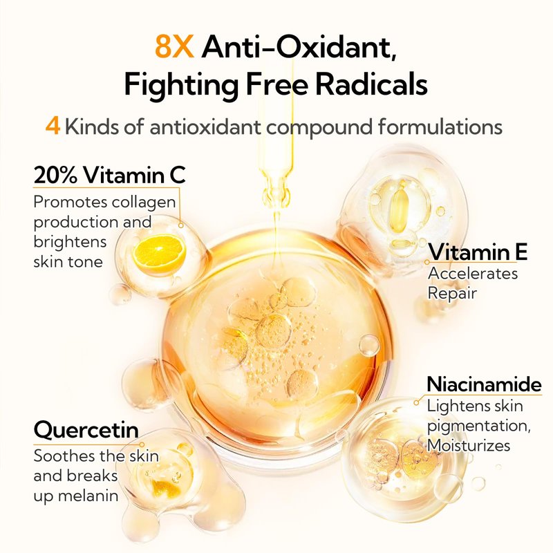 - đ ă8X Antioxidantă: The use of nano-microencapsulated lipid technology provides an extra layer of protection to shield vitamin C and antioxidants from external factors, ensuring maximum efficacy and prolonging the skin's antioxidant defenses. It also eases the release of sensitization caused by skin irritation from the high concentration of vc ingredients.
