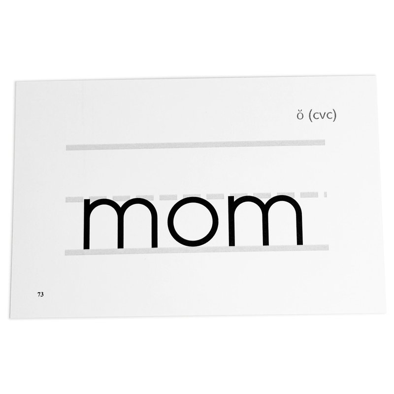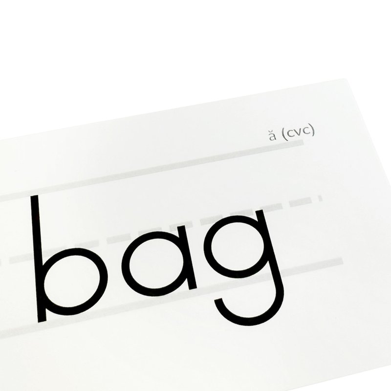 - Word cards display one word per card. The word is presented on the front in a typeface similar to handwriting, while the back has the same word written with upper/lower case lines. This makes it easy to sort the cards into different piles and for the teacher to see the same word that the student is seeing.