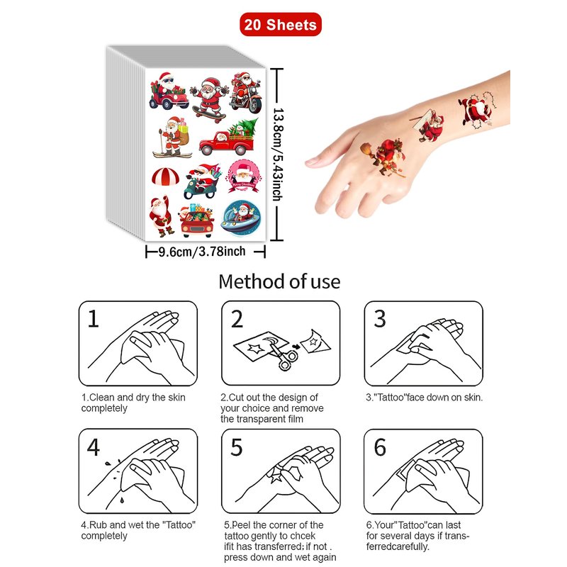 - Easy to Use Xmas temporary tattoos, Cut out the desired motif,remove the plastic covering film of Santa temporary tattoo,then stick the tattoo face down on the clean and tidy skin,wet the tattoo with water,gently pat and press for about 30 seconds,then tear off the paper