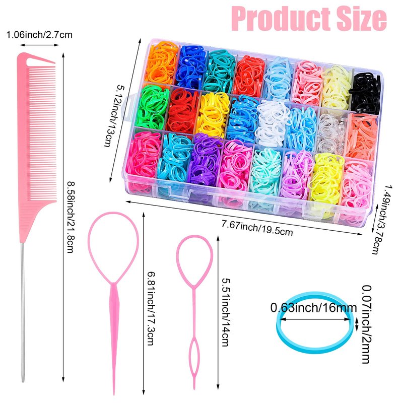 Tips for useThese rubber bands are disposable, not recommended for repeated useFor thick hair, it is recommended to use more than 1 rubber bandFeatures2.Elastic Hair Tie Cutter: The rubber band cutter can not only remove the elastic on the braid, but also can be used to open the envelope, which is widely used3.Neat and Orderly: The colorful rubber bands are packed in a transparent plastic box with 24 grids, each color has a separate grid, so that your rubber bands are not messy, clean and tidy4.Instructions for Accompanying Tools: There is a diagram on the back of the hair tail tools that comes with us, you can check it out, or check out our graphic introduction to see how to use itSpecificationsMaterial: rubberSize: diameter approx 2cm/0.79inchthickness approx 2mm/0.078inchColor: 24 colorPackage include2200 x Hair Rubber Bands2 x Hair Loop Styling Tools1 x Rat Tail Comb 1 x Hair Elastic Band Cutter