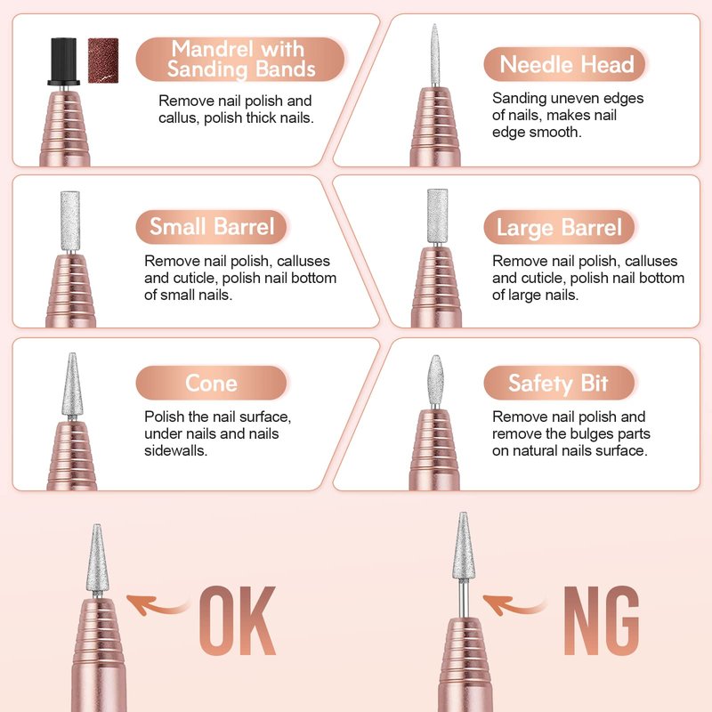 - COMPLETE DRILL BITS SET - The Alles Nail Drill comes with a needle head bit, safety bit, cone bit, large and small barrel and mandrel, making it easy to change the bits without tools. Just make sure to push the bits all the way down securely to avoid shaking.