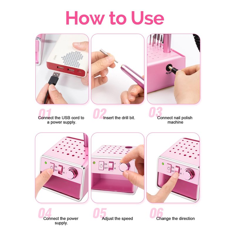 - Upgraded Electric Nail File Set: The compact drill for nails is easy for you to use it with any USB socket, such as power bank, laptop, AC adapter, and even your car charger. No more worry about the adapter cord limited, feel free to enjoy your nail art at home or travel. Its professional & portable lightweight design allows users to practice nails anytime, anywhere. Standard USB port makes it easy to connect any USB device(NOTE: The adapter is not included)
