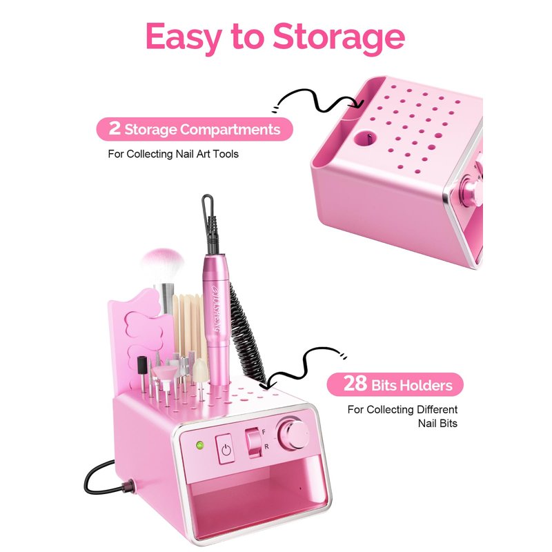- Upgraded Version Nail Drills: The nail filer electric is exclusively designed with 28 nail drill bits collector holes, two convenient storage compartment for you nail art tools such as nail file and buffers. The nail drills for acrylic nails make your nail table neat and convenient, also saves more time and money