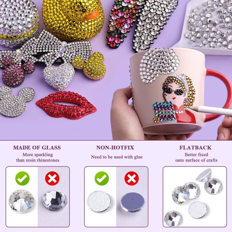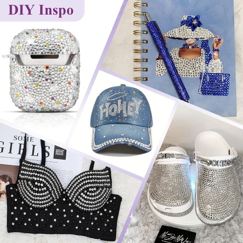- 💎WIDE APPLICATION -- The iridescent and bedazzling gems will remarkably add glitz to your DIY crafts, like shoes, sneakers, high heels, tumblers, mugs, goblets, bottles, clothes, dresses, jeans, hats, masks, glasses, phone cases, popsockets, scrapbooks, diamond paintings, greeting cards, bags, guitars, keychains, hair clips, etc. You can use them for face makeup, eye makeup, body art, 3D nail art as well. Apply it to whatever you want to bedazzle!