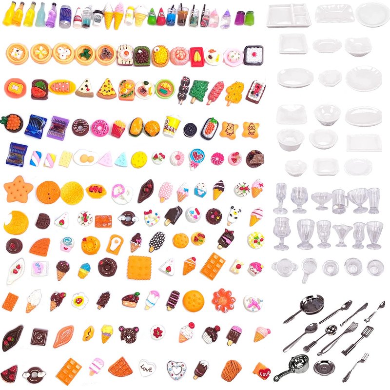 - SUPER VALUE ——200pcs miniature food toys set come with different style mini food, nclude: food, beverage bottles, beverage cans, burgers, French fries, cakes, milk tea, bread, chocolate, ice cream, milk, beverages , kitchenware, tableware and more. Enough quantity and style offers you starting pretend food play,help to relieve stress, develop creativity and imagination, bringing you lots of fun.