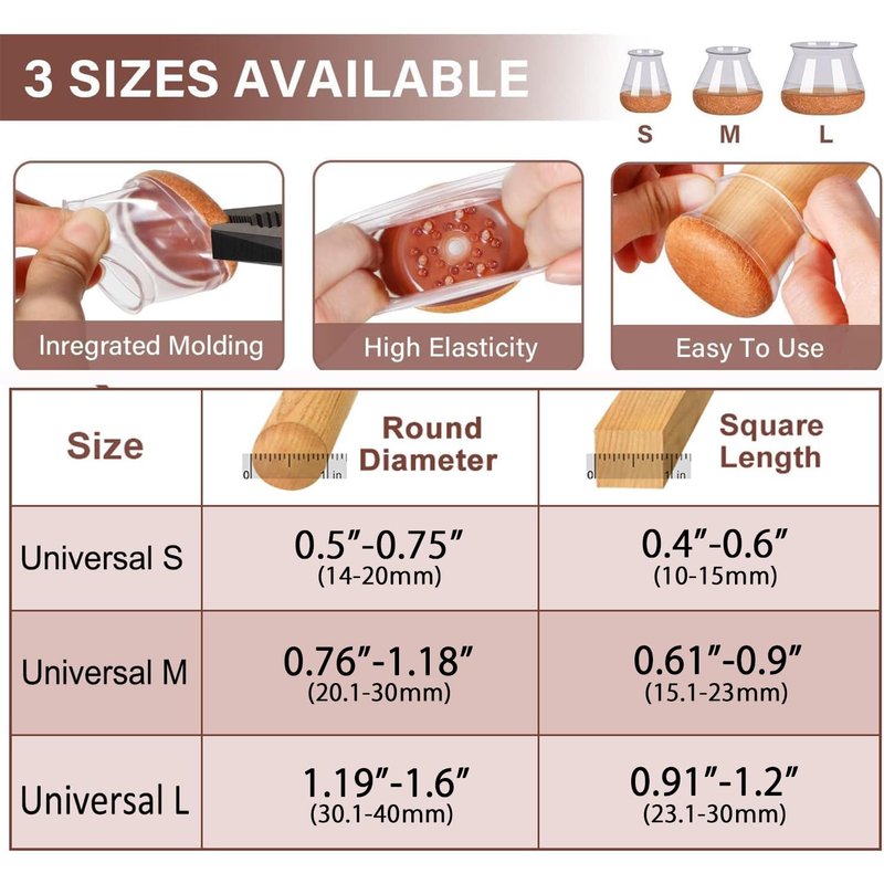- [Stretchable Fit a Range of Sizes]-Chair Leg Floor Protectors is narrow at the top and wide at the bottom to adapt to various sizes. Fit Round leg diameter 0.76" to 1.18"(20.1-30mm).