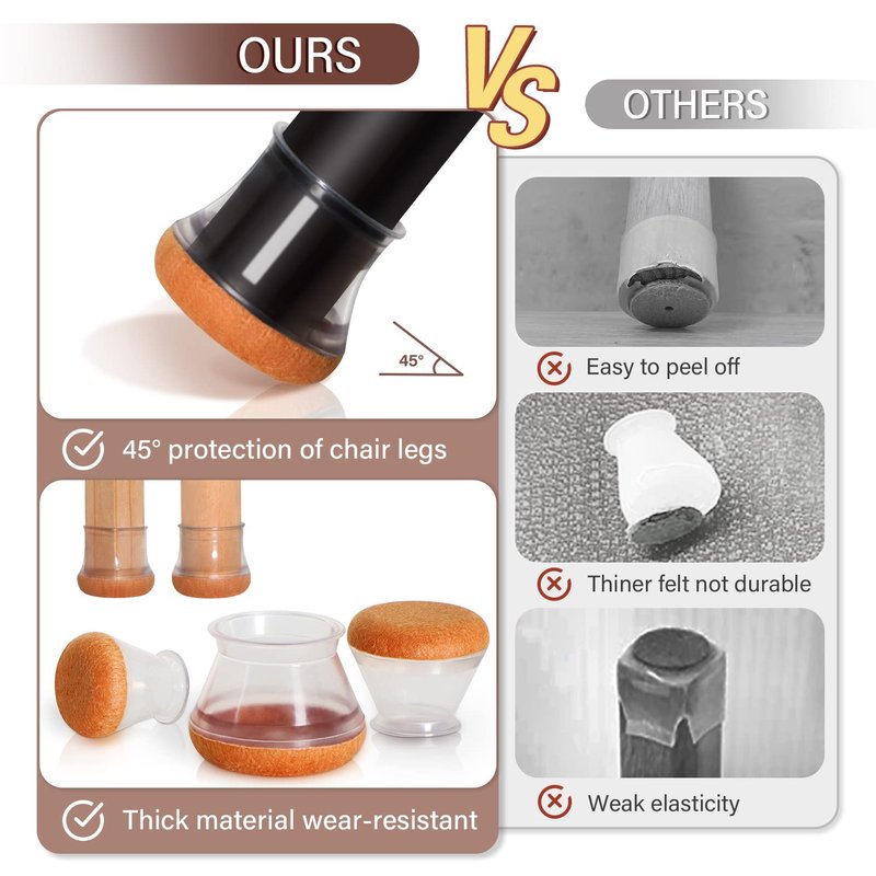 - [Reinforced bottom felt pad]-The new version of the protector features a cup-shaped felt pad, which provides better protection to the floor and the protector itself compared to a thin flat pad. The reinforced bottom design makes it more secure to fit the chair legs, avoiding sliding and moving. Moreover, you can tilt the chair at any angle without worrying about damaging the floor and the protector itself. It has a longer lifespan and can better protect the floor.