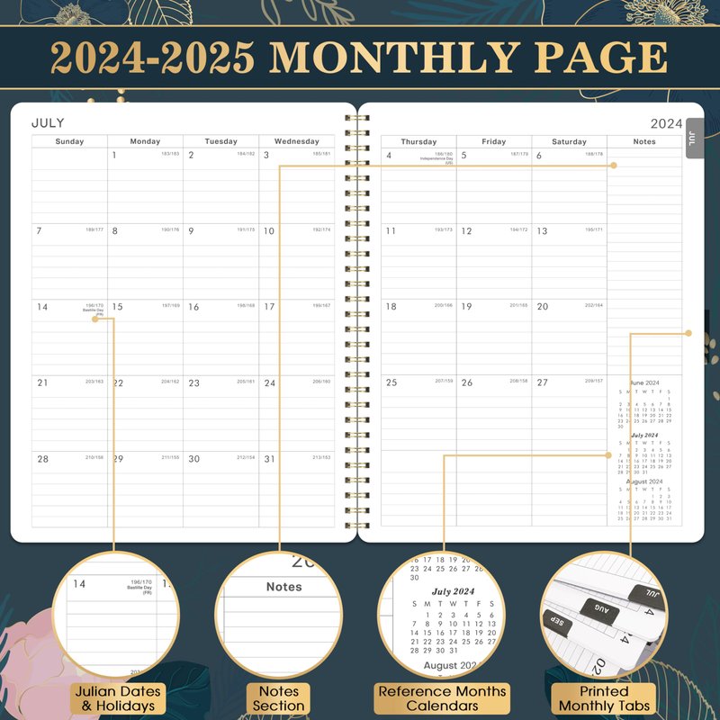 - 🌸2024-2025 Monthly Planning - There are ruled daily blocks + Julian Dates + Holidays Reminders in each monthly page for your monthly planning. Besides, the past, Present and future monthly reference calendars on the page for long-term planning and the note section for your priorities of the month.