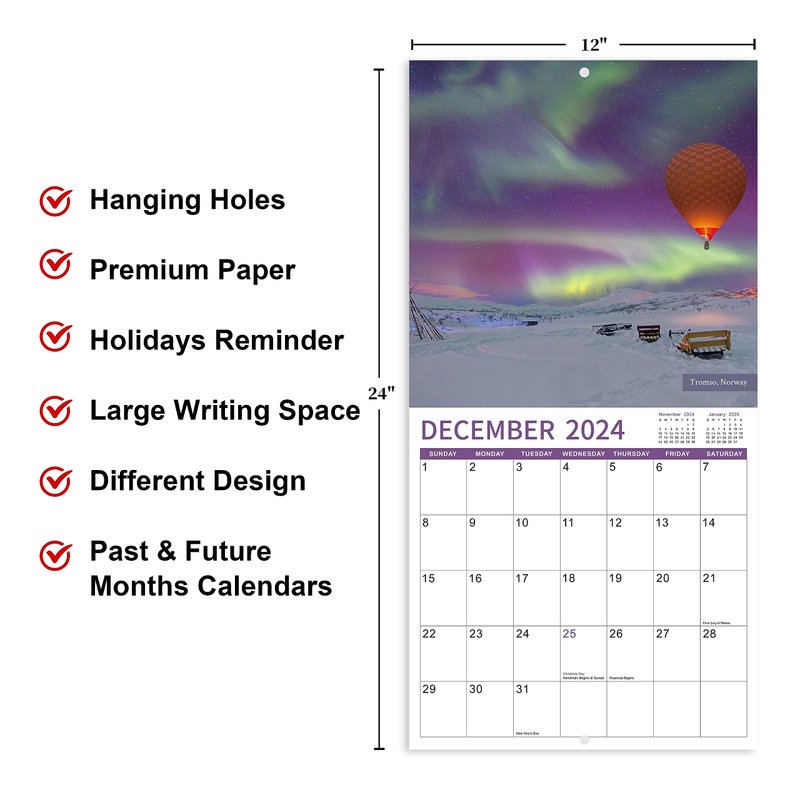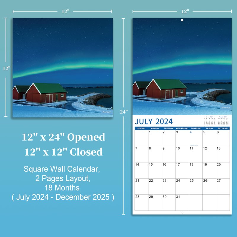 - 🌠Ample Writing Blocks - The size of the Aurora Borealis Calendar 2024-2025 is 12'' x 12'' (Closed), 12'' x 24'' (Opened). Each page of the 2024-2025 calendar is made up of ample blocks(1.6'' x 1.8''), which provide sufficient writing space for you to jot down daily appointment. Highlighted Federal holidays help remind you of important holidays and manage your life efficiently.