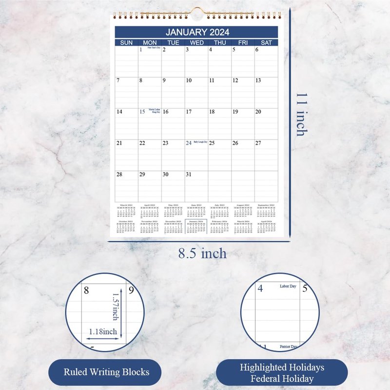 This 12 months vertical wall calendar runs from January 2024 to December 2024, measures 8.5 x 11 inches, makes it perfect for workspace or fridge, or it can lay flat on your desktop, table or counter top. This office calendar with lined daily blocks. Each block is 1.15 x 1.55 inch with plenty of writing space for for planning your appointments and to-do reminders. It helps to track your daily easily and efficiently