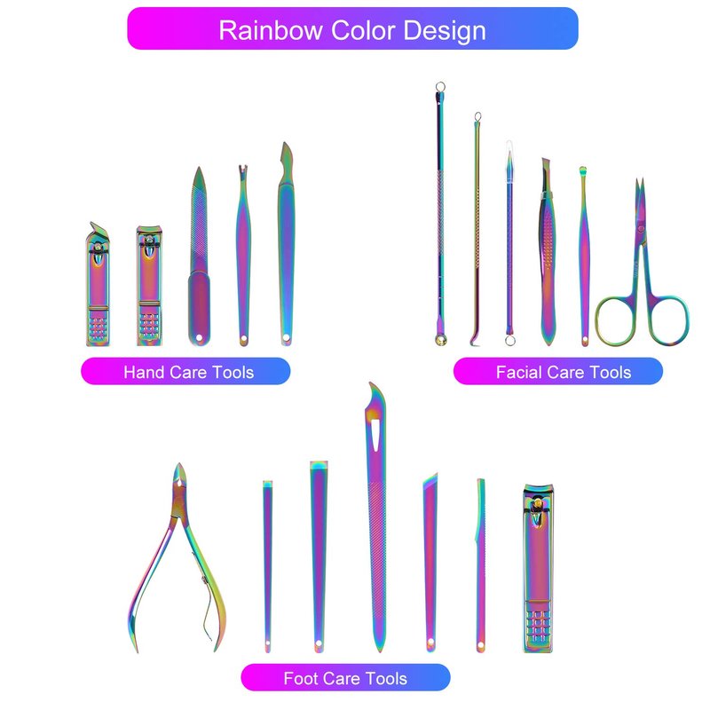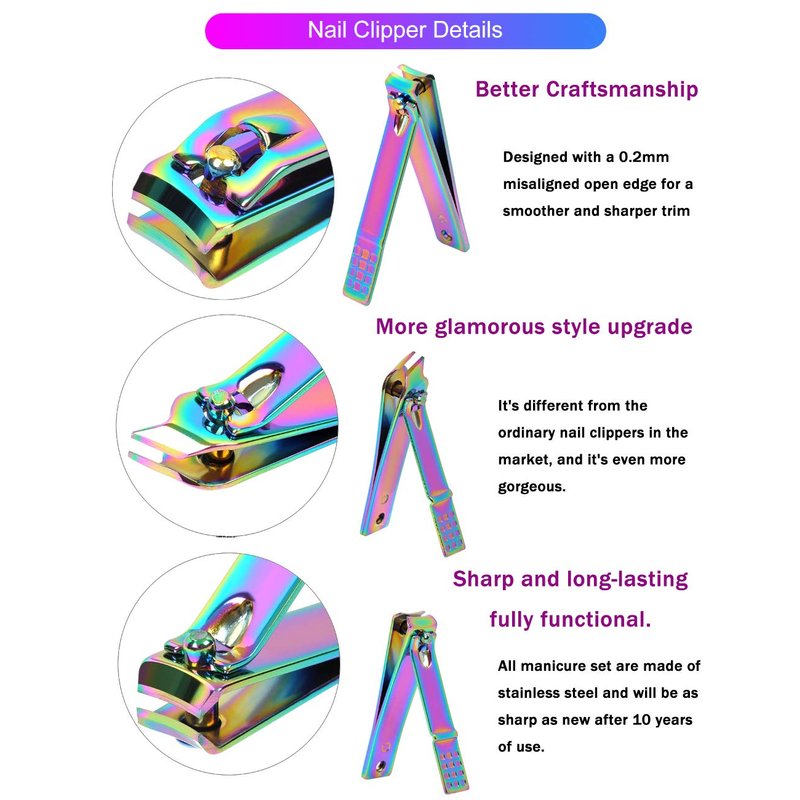 This rainbow manicure kits including high quality nail clippers, cuticle pusher, cuticle nipper and other usefully accessories.