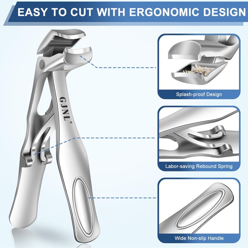 - 7️⃣【Angled Head Toenail Clipper for Easier Trimming】The nail clipper adopts an ergonomic design with a curved 7-angle head, which allows you to clearly see the edge of the blade and the nails, so that you can cut nails accurately and confidently, no longer need to twist and bend your body when cutting toenails. The newly upgraded nail clippers with a catcher feature a splash-proof design and a wide Jaw curved blade that can open up to 12 mm, enough to trim any thick nails.